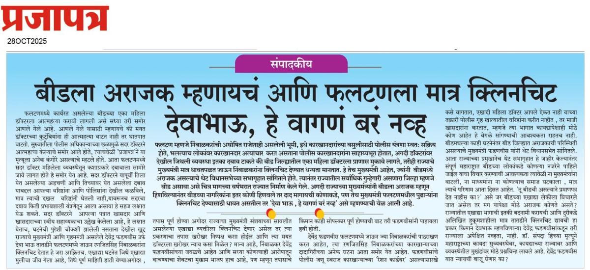 फलटणमध्ये कार्यरत असलेल्या बीडच्या एका महिला डॉक्टरला आत्महत्या करावी लागली असे सध्या तरी समोर आणले गेले आहे. आणले गेले यासाठी म्हणायचे की मयत डॉक्टरच्या कुटुंबियांना ही आत्महत्या वाटत नाही तर घातपात वाटतो. सुरुवातीला पोलीस अधिकाऱ्याच्या छळामुळे सदर डॉक्टरने आत्महत्या केल्याचे समोर आले होते, त्याचवेळी 'प्रजापत्र'ने या मृत्यूला अनेक कंगोरे असल्याचे म्हटले होते. आता फलटणमध्ये सदर डॉक्टर महिलेला व्यवस्थेतून कशाप्रकारे दबावाला सामोरे जावे लागत होते हे समोर येत आहे. सदर डॉक्टरने यापूर्वी तिला येत असलेल्या अडचणी आणि तिच्यावर येत असलेला दबाव याबद्दल आपल्या वरिष्ठांना आणि पोलिसांना देखील कळविले, मात्र त्याची दखल वरिष्ठांनी घेतली नाही,यावरूनच सदरचा दबाव किती प्रभावशाली यंत्रणेतून आला असावा हे सहज लक्षात येऊ शकते. सदर डॉक्टरने आपल्या पत्रात खासदार आणि खासदाराच्या स्वीय सहाय्यकाचा उल्लेख केलेला आहे, हे लक्षात येताच, घटनेची पुरेशी चौकशी झालेली नसताना देखील खुद्द राज्याचे मुख्यमंत्री आणि गृहममंत्री असलेले देवेंद्र फडणवीस उर्फ देवा भाऊ तातडीने फलटणमध्ये जाऊन रणजितसिंह निंबाळकरांना क्लिनचिट देतात हे जरा आक्रितच. एखाद्या घटनेत जिथे एखाद्या मुलीचा जीव गेला आहे, तिथे पूर्ण माहिती हाती येण्याअगोदर , तपास पूर्ण होण्या अगोदर राज्याचा मुख्यमंत्री संशयाच्या सावलीत असलेल्या एखाद्या व्यक्तीला क्लिनचिट देणार असेल तर त्या प्रकरणाचा तपास खरोखर निष्पक्ष कसा होईल आणि त्या मयत डॉक्टरला खरोखर न्याय कसा मिळेल? मान्य आहे, निंबाळकर देवेंद्र फडणवीसांच्या जवळचे आहेत आणि सध्या कोणत्याही आरोपातून वाचण्याचा शेवटचा मुक्काम भाजप हाच आहे, पण म्हणून तपासाचे किमान काही सोपस्कार पूर्ण होण्याची वाट तरी फडणवीसांनी पाहायला हवी होती.