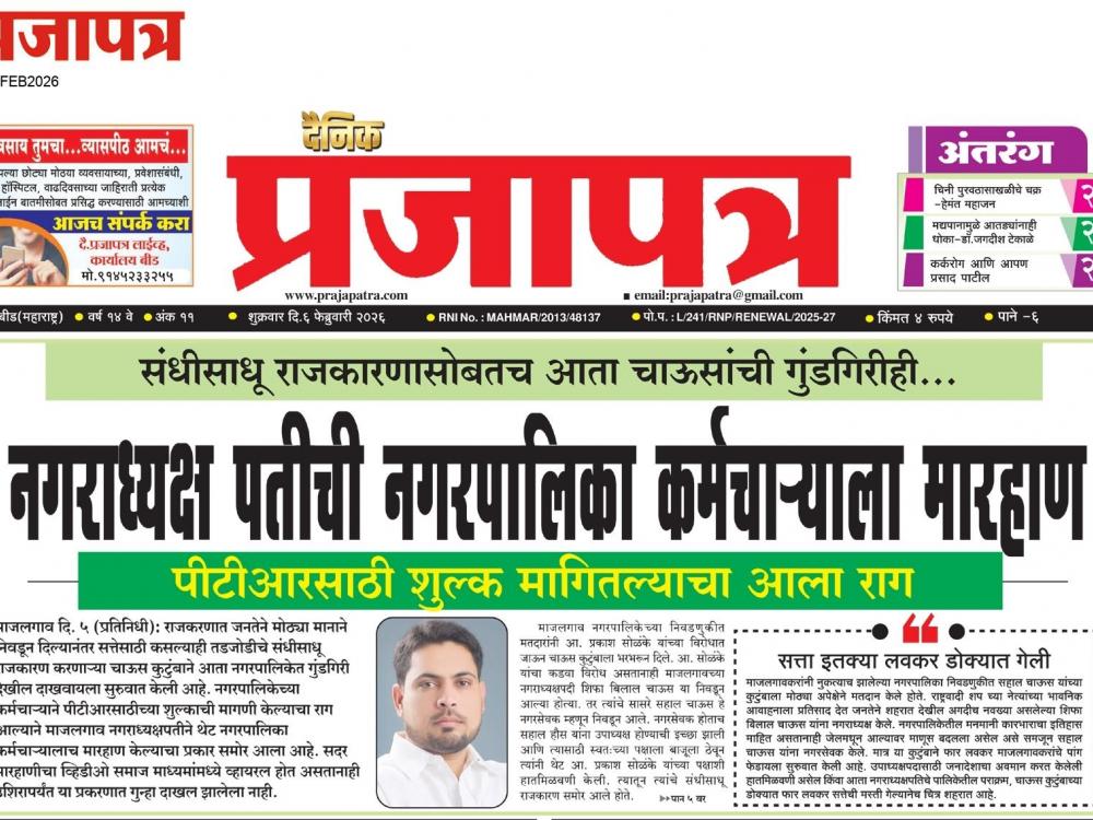 माजलगाव दि. ५ (प्रतिनिधी ) : राजकरणात जनतेने मोठ्या मानाने निवडून दिल्यानंतर सत्तेसाठी कसल्याही तडजोडीचे संधीसाधू राजकारण करणाऱ्या चाऊस कुटुंबाने आता नगरपालिकेत गुंडगिरी देखील दाखवायला सुरुवात केली आहे. नगरपालिकेच्या कर्मचाऱ्याने पीटीआरसाठीच्या शुल्काची मागणी केल्याचा राग आल्याने मजळगावात नगराध्यक्षपटीने थेट नगरपालिका कर्मचाऱ्यालाच मारहाण केल्याचा प्रकार समोर आला आहे. सदर मारहाणीचा व्हिडीओ समाज माध्यमांमध्ये व्हायरल होत असतानाही उशिरापर्यंत या प्रकरणात गुन्हा दाखल झालेला नाही.