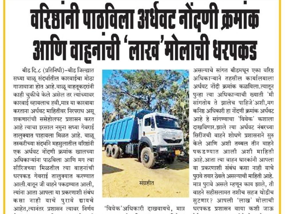 बीड दि. ८ (प्रतिनिधी ) : बीड जिल्ह्यात सध्या वाळू संदर्भातील कारवाईचा मोठा गाजावाजा होत आहे. वाळू वाहतूकदारानी काही चुकीचे केले असेल तर त्यांच्यावर कारवाई व्हायलाच हवी, मात्र या कारवाया करताना अर्धवट माहितीवर निरपराध असू शकणारांची ससेहोलपट प्रशासन करत आहे त्याचा इरसाल नमुना सध्या गेवराई तालुक्यात पाहायला मिळत आहे. वाळू तस्करीच्या संदर्भाने महसुलातील वरिष्ठांनी एक अर्धवट नोंदणी क्रमांक खालच्या अधिकाऱ्यांना पाठविला आणि मग त्या सीरिजच्या मिळतील त्या वाहनांची धरपकड गेवराई तालुक्यात करण्यात आली. यातून जी वाहने पकडण्यात आली, त्यांना आता आपला या प्रकरणाशी संबंध कसा नाही याचे पुरावे द्यायचे आहेत, त्यानंतर प्रशासन त्यावर निर्णय घेणार. आता इतकी 'लाख ' मोलाची धरपकड असल्यावर वाहने निरपराध असली तरी सहज सुटणार थोडीच ?