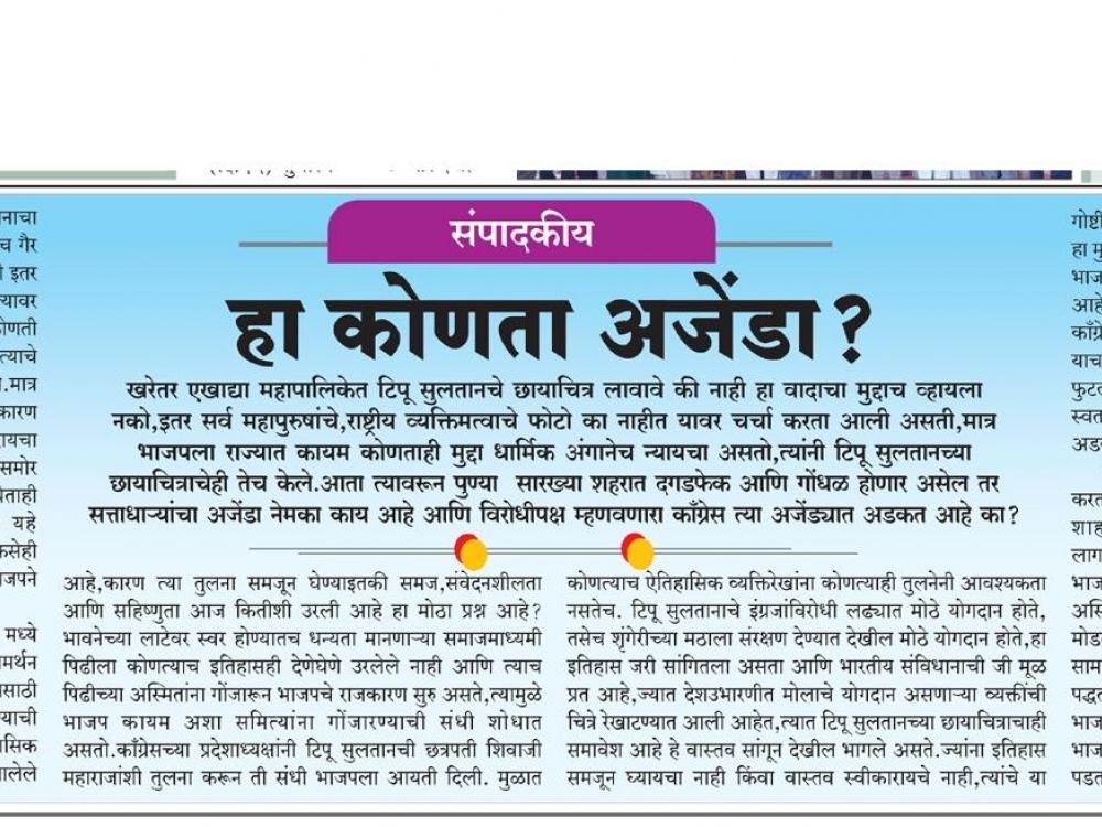 खरेतर एखाद्या महापालिकेत टिपू सुलतानचे छायाचित्र लावावे की नाही हा वादाचा मुद्दाच व्हायला नको,इतर सर्व महापुरुषांचे,राष्ट्रीय व्यक्तिमत्वाचे फोटो का नाहीत यावर चर्चा करता आली असती,मात्र भाजपला राज्यात कायम कोणताही मुद्दा धार्मिक अंगानेच न्यायचा असतो,त्यांनी टिपू सुलतानच्या छायाचित्राचेही तेच केले.आता त्यावरून पुण्या सारख्या शहरात दगडफेक आणि गोंधळ होणार असेल तर सत्ताधाऱ्यांचा अजेंडा नेमका काय आहे आणि विरोधीपक्ष म्हणवणारा काँग्रेस त्या अजेंड्यात अडकत आहे का ?