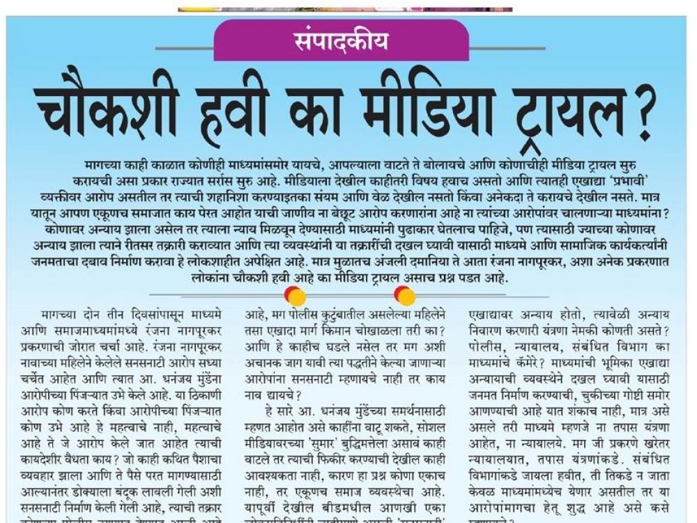 मागच्या काही काळात कोणीही माध्यमांसमोर यायचे, आपल्याला वाटते ते बोलायचे आणि कोणाचीही मीडिया ट्रायल सुरु करायची असा प्रकार राज्यात सर्रास सुरु आहे. मीडियाला देखील काहीतरी विषय हवाच असतो आणि त्यातही एखाद्या 'प्रभावी' व्यक्तीवर आरोप असतील तर त्याची शहानिशा करण्याइतका संयम आणि वेळ देखील नसतो किंवा अनेकदा ते करायचे देखील नसते. मात्र यातून आपण एकूणच समाजात काय पेरत आहोत याची जाणीव ना बेछूट आरोप करणारांना आहे ना त्यांच्या आरोपांवर चालणाऱ्या माध्यमांना? कोणावर अन्याय झाला असेल तर त्याला न्याय मिळवून देण्यासाठी माध्यमांनी पुढाकार घेतलाच पाहिजे, पण त्यासाठी ज्याच्या कोणावर अन्याय झाला त्याने रीतसर तक्रारी कराव्यात आणि त्या व्यवस्थांनी या तक्रारींची दखल घ्यावी यासाठी माध्यमे आणि सामाजिक कार्यकर्त्यांनी जनमताचा दबाव निर्माण करावा हे लोकशाहीत अपेक्षित आहे. मात्र मुळातच अंजली दमानिया ते आता रंजना नागपूरकर, अशा अनेक प्रकरणात लोकांना चौकशी हवी आहे का मीडिया ट्रायल असाच प्रश्न पडत आहे.