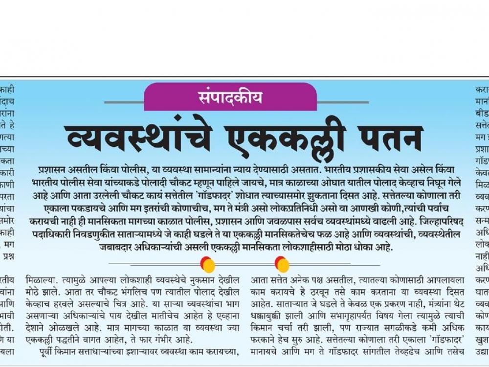 प्रशासन असतील किंवा पोलीस, या व्यवस्था सामान्यांना न्याय देण्यासाठी असतात. भारतीय प्रशासकीय सेवा असेल किंवा भारतीय पोलीस सेवा यांच्याकडे पोलादी चौकट म्हणून पाहिले जायचे, मात्र काळाच्या ओघात यातील पोलाद केव्हाच निघून गेले आहे आणि आता उरलेली चौकट कायं सत्तेतील 'गॉडफादर ' शोधात त्याच्यासमोर झुकताना दिसत आहे. सत्तेतल्या कोणाला तरी एकाला पकडायचे आणि मग इतरांची कोणाचीच , मग ते मंत्री असो लोकप्रतिनिधी असो वा आणखी कोणी , त्यांची पर्वाच करायची नाही ही मानसिकता मागच्या काळात पोलीस, प्रशासन आणि जवळपास सर्वच व्यवस्थांमध्ये वाढली आहे. जिल्हापरिषद पदाधिकारी निवडणुकीत साताऱ्यामध्ये जे काही घडले ते या एककल्ली मानसिकतेचेच फळ आहे आणि व्यवस्थांची, व्यवस्थेतील जबाबदार अधिकाऱ्यांची असली एककल्ली मानसिकता लोकशाहीसाठी मोठा धोका आहे.