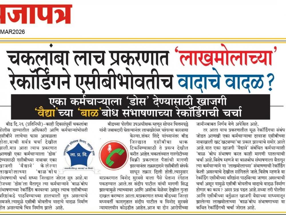 बीड दि.२६ (प्रतिनिधी)-काही दिवसांपूर्वी चकलांबा पोलीस ठाण्यातील अधिकारी आणि कर्मचाऱ्यांभोवती एसीबीने लाचेचा फास आवळला होता.याची सर्वत्र चर्चा देखील झाली.मात्र आता त्याच प्रकरणात आणखी एका कर्मचाऱ्याला 'डोस' देण्यासाठी एसीबीच्या नावावर एका खाजगी 'वैद्याने' केलेल्या लाखमोलाच्या 'बाळ'बोध संभाषणाची चर्चा सध्या जिल्ह्यात जोरात सुरु आहे.या रोजच्या 'डोस'ला वैतागून त्या कर्मचाऱ्याने 'बाळ'बोध संभाषणाच्या रेकॉर्डिंग बनवल्या असून त्याच एसीबीच्या वरिष्ठांकडे पाठविण्याच्या हालचाली सुरु असल्याचे समजते.त्यामुळे एसीबी भोवतीच वादाचे वादळ निर्माण होत असल्याचे चित्र निर्माण झाले आहे. बीडच्या पोलीस उपअधीक्षक म्हणून सोपान चित्तमपल्ले यांनी जबाबदारी घेतल्यानंतर लाचखोरांवर चांगल्या कारवाया केल्या.शंकर शिंदे यांच्यानंतर बीड जिल्ह्यात एसीबीचा धाक टिकविण्यासाठी ते प्रयत्न देखील करीत आहेत.चकलांब्यात गारगोटीच्या विक्री प्रकरणात पैशांची मागणी झाल्यानंतर तक्रारदाराने एसीबीशी संपर्क साधून तक्रार दिली होती.त्यानुसार याप्रकरणात विनोद सुरवसे याला पैसे घेताना रंगेहात पकडण्यात आले.तर संदीप पाटील यांची मागणी सिद्ध झाल्यामुळे त्याच्यावर आणि अशोक येळेवर देखील गुन्हा दाखल करण्यात आला.याप्रकरणात सध्या बीडच्या जिल्हा मध्यवर्ती कारागृहात संदीप पाटील व विनोद सुरवसे न्यायालयीन कोठडीत आहेत.आज या दोन आरोपींच्या जामीनबाबत निर्णय येणे अपेक्षित आहे. तर आता याच प्रकरणातील मूळ रेकॉर्डिंगचा संबंध जोडत आणखी एका कर्मचाऱ्याचा दरवाजा एसीबीच्या नावाखाली खट'खटवण्या'चा प्रकार झाल्याचे समोर आले आहे.यात एका खाजगी 'वैद्याने' संबंधित कर्मचाऱ्याशी 'बाळ 'बोध संभाषण करत काही मागणी घातल्याची चर्चा आहे.विशेष म्हणजे या बाळबोध संभाषणाला वैतागून त्या कर्मचाऱ्याने या 'लाखमोलाच्या' संभाषणाची रेकॉर्डिंग केली असल्याचे देखील सांगितले जाते.विशेष म्हणजे या रेकॉर्डिंग एसीबीच्या वरिष्ठांना पाठविल्या जाणार असल्याची चर्चा असून यामुळे एसीबी भोवतीच वादाचे वादळ निर्माण होणार का काय? असा प्रश्न पडत आहे.सध्या तरी पोलीस आणि एसीबीच्या वर्तुळात खाजगी वैद्याच्या माध्यमातून झालेल्या लाखमोलाच्या 'बाळ'बोध संभाषणाच्या या कथित रेकॉर्डिंगची चर्चा जोरात आहे.