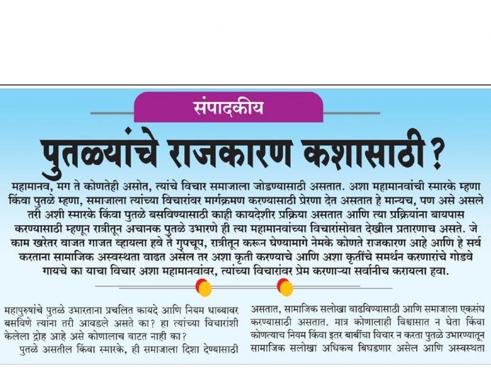 पुतळे असतील किंवा स्मारके, ही समाजाला दिशा देण्यासाठी असतात, सामाजिक सलोखा वाढविण्यासाठी आणि समाजाला एकसंघ करण्यासाठी असतात. मात्र कोणालाही विश्वासात न घेता किंवा कोणत्याच नियम किंवा इतर बाबींचा विचार न करता पुतळे उभारण्यातून सामाजिक सलोखा अधिकच बिघडणार असेल आणि अस्वस्थता वाढणार असेल तर यातून आपल्याला नेमके काय साधायचे आहे? यातून कोणाला कोणते राजकारण करायचे आहे का? आणि याचा एकूणच समाज व्यवस्थेवर कसा परिणाम होणार आहे, याबद्दल सरकार, विरोधीपक्ष, लोकप्रतिनिधी सारेच मूग गिळून गप्प का आहेत? खरेतर रोज कोणत्यातरी गावात रात्रीतून एखादा पुतळा उभारला जात असताना आणि पुन्हा त्यातून कायदा सुव्यवस्थेचा प्रश्न निर्माण होण्याचे चित्र असताना सरकार आणि प्रशासन नावाची यंत्रणा झोपली आहे का झोपेचे सोंग घेऊन याकडे सोयीस्कर दुर्लक्ष करत आहे? असे अनेक प्रश्न आज महाराष्ट्रातील कोणत्याही सुसंकृत आणि महामानवांच्या विचारांवर चालणार्या सजग नागरिकाला पडत आहेत, मात्र यातील कोणताच प्रश्न नेते म्हणविणारांना पडत नाही, किंवा त्यांना यावर काही बोलून कोणालाच दुखवायचे नाही अशी त्यांची भूमिका असेल तर अशा सार्या प्रकारांना या व्यवस्थेचे मुकसमर्थन आहे असे समजायचे का? मागच्या दोन दिवसात किमान समाजमाध्यमांमध्ये काही लोकांनी तरी ‘सामाजिक अस्वस्थता वाढत असेल तर असे पुतळे आवश्यक आहेत का?’ असा सवाल विचारात आम्ही महामानवाचे वैचारिक वारसदार आहोत असे सांगण्याचा प्रयत्न केला आहे, अशा वैचारिक वारासदारांचा आवाज अधिक मोठा व्हावा आणि कोणालाच पुतळ्याचे राजकारण करण्याची संधी मिळू नये इतकीच अपेक्षा महाराष्ट्र ठेवून आहे.