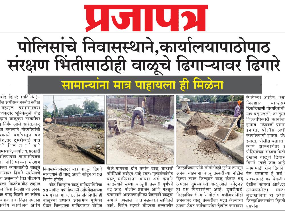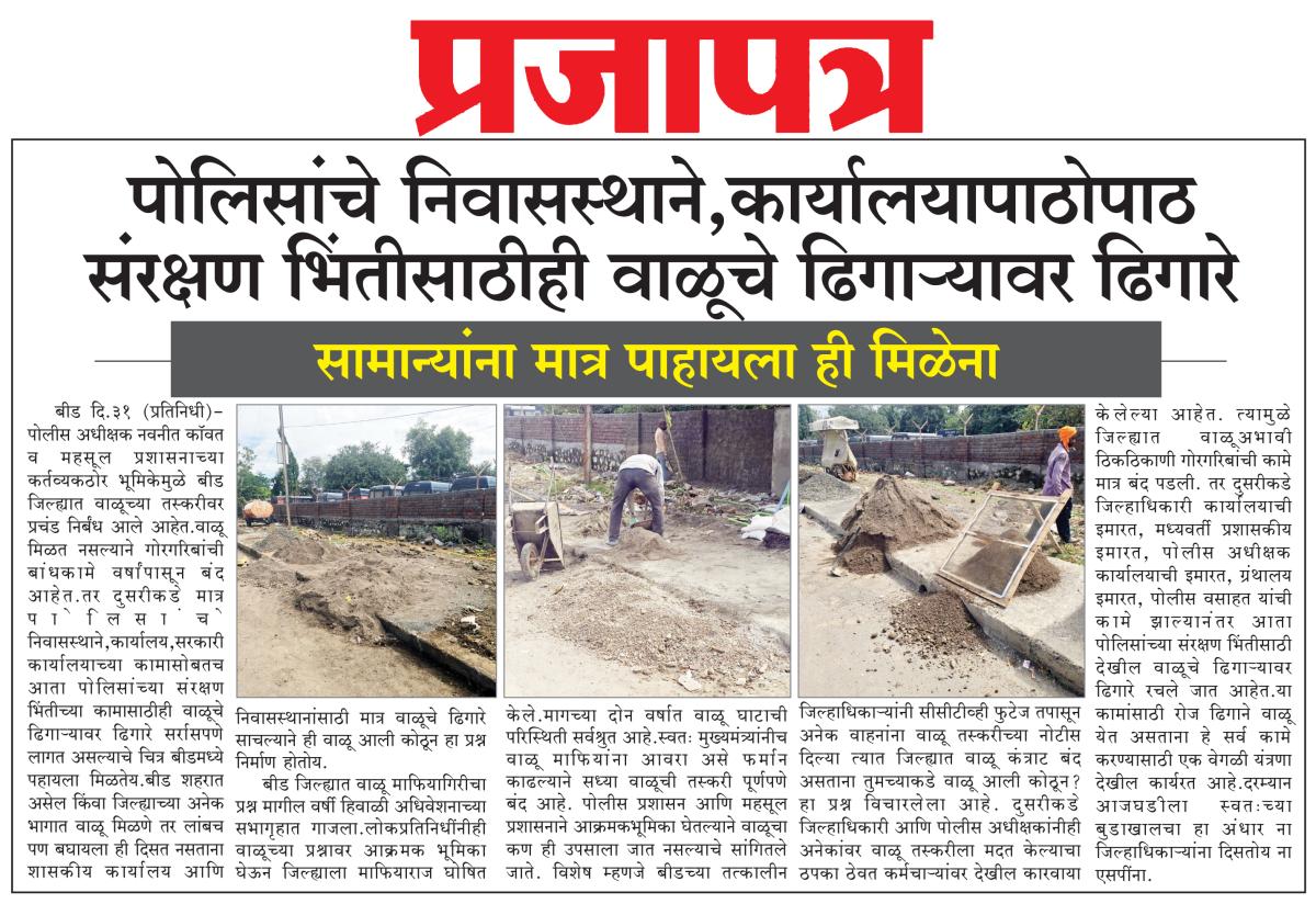 बीड जिल्ह्यात वाळू माफियागिरीचा प्रश्न मागील वर्षी हिवाळी अधिवेशनाच्या सभागृहात गाजला.लोकप्रतिनिधींनीही वाळूच्या प्रश्नावर आक्रमक भूमिका घेऊन जिल्ह्याला माफियाराज घोषित केले.मागच्या दोन वर्षात वाळू घाटाची परिस्थिती सर्वश्रुत आहे.स्वतः मुख्यमंत्र्यांनीच वाळू माफियांना आवरा असे फर्मान काढल्याने सध्या वाळूची तस्करी पूर्णपणे बंद आहे. पोलीस प्रशासन आणि महसूल प्रशासनाने आक्रमक भूमिका घेतल्याने वाळूचा कण ही उपसाला जात नसल्याचे सांगितले जाते. विशेष म्हणजे बीडच्या तत्कालीन जिल्हाधिकाऱ्यांनी सीसीटीव्ही फुटेज तपासून अनेक वाहनांना वाळू तस्करीच्या नोटीस दिल्या त्यात जिल्ह्यात वाळू कंत्राट बंद असताना तुमच्याकडे वाळू आली कोठून? हा प्रश्न विचारलेला आहे. दुसरीकडे जिल्हाधिकारी आणि पोलीस अधीक्षकांनीही अनेकांवर वाळू तस्करीला मदत केल्याचा ठपका ठेवत कर्मचाऱ्यांवर देखील कारवाया केलेल्या आहेत. त्यामुळे जिल्ह्यात वाळूअभावी ठिकठिकाणी गोरगरिबांची कामे मात्र बंद पडली. तर दुसरीकडे जिल्हाधिकारी कार्यालयाची इमारत, मध्यवर्ती प्रशासकीय इमारत, पोलीस अधीक्षक कार्यालयाची इमारत, ग्रंथालय इमारत, पोलीस वसाहत यांची कामे झाल्यानंतर आता पोलिसांच्या संरक्षण भिंतीसाठी देखील वाळूचे ढिगाऱ्यावर ढिगारे रचले जात आहेत.या कामांसाठी रोज ढिगाने वाळू येत असताना हे सर्व कामे करण्यासाठी एक वेगळी यंत्रणा देखील कार्यरत आहे.दरम्यान आजघडीला स्वतःच्या बुडाखालचा हा अंधार ना जिल्हाधिकाऱ्यांना दिसतोय ना एसपींना.