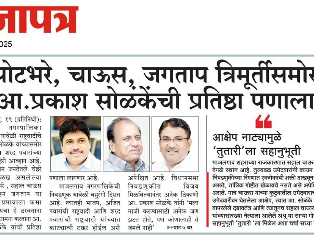 माजलगाव नगरपालिकेची निवडणूक यावेळी बहुरंगी दिसत आहे. त्यातही भाजप, अजित पवारांची राष्ट्रवादी आणि शरद पवारांची राष्ट्रवादी यांच्यात काट्याची टक्कर होईल असे अपेक्षित आहे. विधानसभा निवडणुकीत विजय मिळविल्यानंतर अनेक ठिकाणी आ. प्रकाश सोळंके यांनी 'मला माजी करण्यासाठी अनेक जण झटत होते , पण कोणालाही ते जमले नाही ' असे सांगत त्यांच्या विरोधकांना डिवचण्याचेच काम केले. त्यामुळे आता माजलगाव मनगरपालिकेत त्यांची कोंडी करण्यासाठी शरद पवारांच्या राष्ट्रवादीने मोठा व्यूह आखला आहे.मोहन जगतापांनी सहाल चाऊस यांच्या कुटुंबात उमेदवारी दिली आहे. शहरात स्वतः मोहन जगताप यांचे वर्चस्व चांगले आहे, तर सहाल चाऊस यांचा स्वतःचा प्रभाव आणि त्यांची शहराची जाण याला तोडनसल्याची राजकीय परिस्थिती आहे. त्यातही माजलगावच्याच नव्हे तर जिल्ह्याच्या राजकारणावर प्रभाव ठेवून असलेल्या बाबुराव पोटभरे यांनी यावेळी तुतारीला साथ देण्याची भूमिका घेतल्याचे चित्र स्पष्ट होत आहे. बाबुराव पोटभरे यांचा प्रभाव केवळ आंबडेकर चळवळीच्या मतदारांवरच नव्हे तर शहरातील इतरही समूहांवर आहे. त्यांच्या निवासस्थानी कायम शहरातील विविध समस्यांची सोडवणूक सुरु असते. त्यामुळे बाबुराव पोटभरे यांनी जगताप आणि चाऊस यांच्या जोडीला जाणे म्हणजे आ. सोळंके यांची डोकेदुखी अधिकच वाढविणारे आहे. मधल्या काळात , म्हणजे विधानसभा निवडणुकीतील विजयानंतर ' मला अनेकांनी विरोध केला ते बरेच झाले, आता किमान त्यांच्यामुळे मी निवडणून येत होतो असे तर कोणी म्हणणार नाही ' असे देखील आ. सोळंके खाजगीत म्हणायचे असे सांगितले जाते. हा सारा प्रकार त्यांना विधानसभेत विरोध करणाऱ्या बाबुराव पोटभरे आणि इतरांना डिवचणारा ठरलेला आहे. त्यातच भाजपसोबत युती करण्याची राष्ट्रवादीच्या कार्यकर्त्यांची इच्छा होती, मात्र त्याला भाजपने प्रतिसादच दिला नाही. त्यामुळे एकीकडे भाजपचे आव्हान आणि दुसरीकडे जगताप , पोटभरे , चाऊस या त्रिमूर्तींचा प्रभाव यामुळे आ. सोळंके यांची प्रतिष्ठा आता पणाला लागली आहे.
