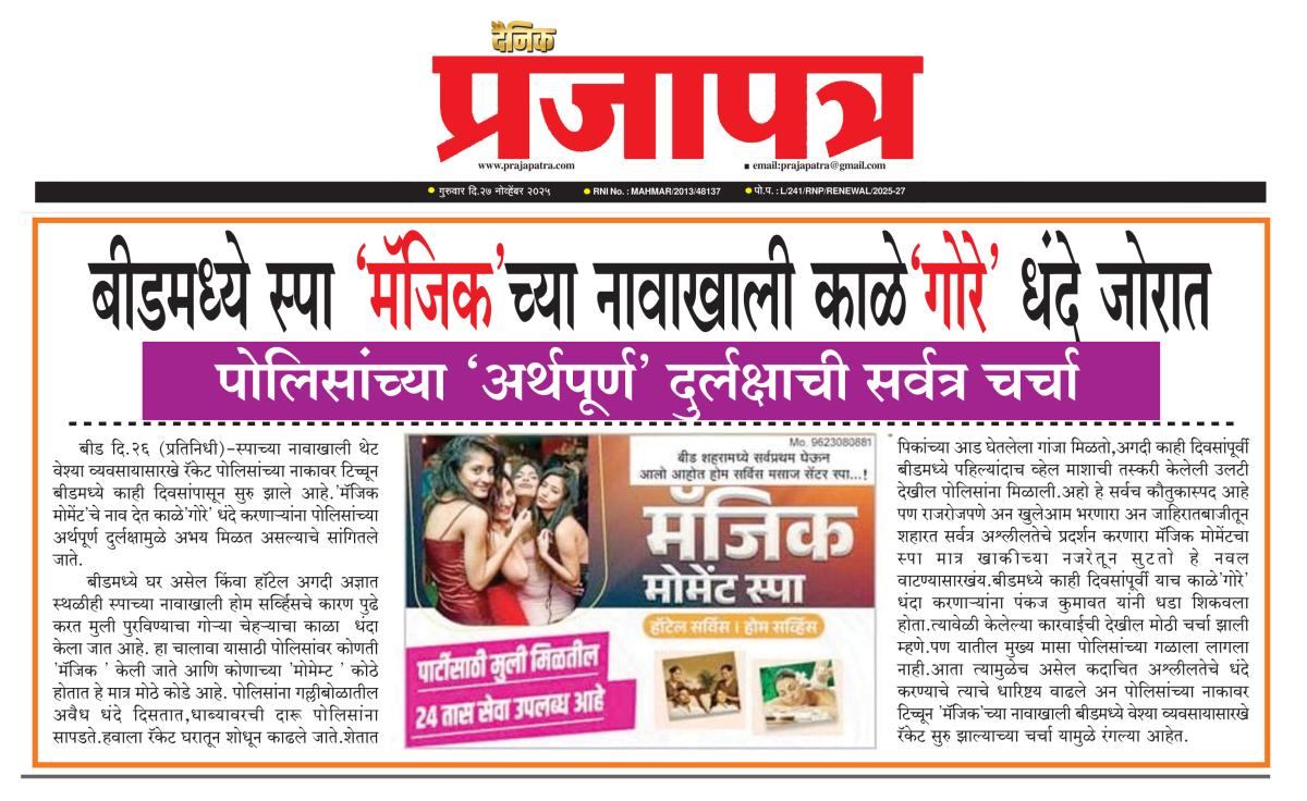 बीडमध्ये घर असेल किंवा हॉटेल अगदी अज्ञात स्थळीही स्पाच्या नावाखाली होम सर्व्हिसचे कारण पुढे करत मुली पुरविण्याचा गोऱ्या चेहऱ्याचा काळा धंदा केला जात आहे. हा चालावा यासाठी पोलिसांवर कोणती 'मॅजिक' केली जाते आणि कोणाच्या 'मोमेम्ट' कोठे होतात हे मात्र मोठे कोडे आहे.