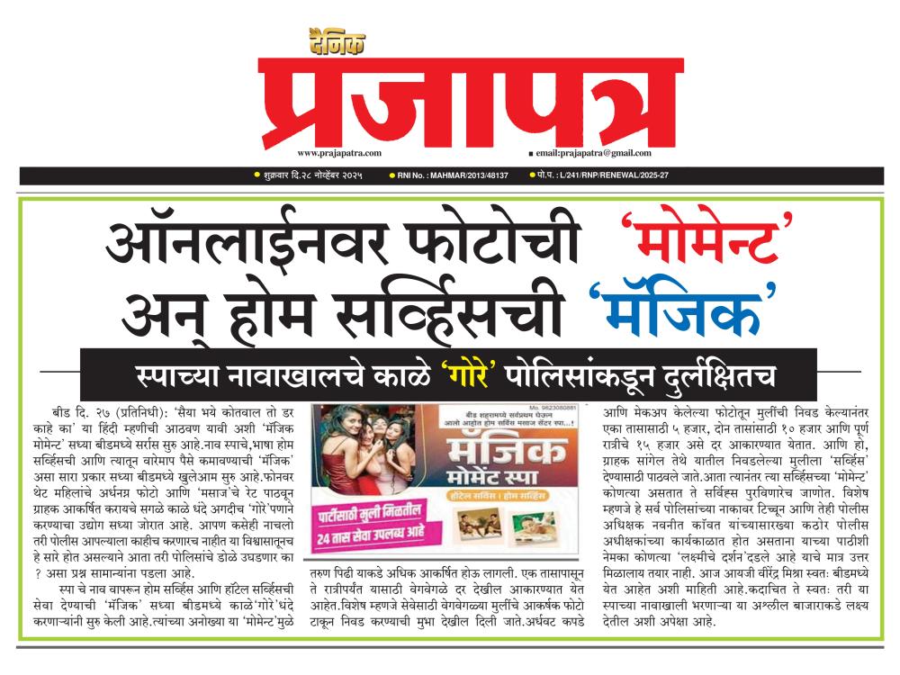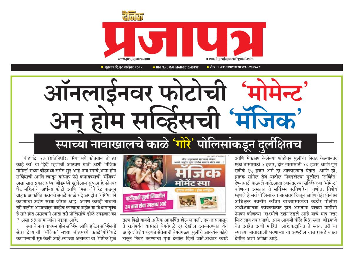 स्पा चे नाव वापरून होम सर्व्हिस आणि हॉटेल सर्व्हिसची सेवा देण्याची 'मॅजिक' सध्या बीडमध्ये काळे'गोरे'धंदे करणाऱ्यांनी सुरु केली आहे.त्यांच्या अनोख्या या 'मोमेन्ट'मुळे तरुण पिढी याकडे अधिक आकर्षित होऊ लागली.एक तासापासून ते रात्रीपर्यंत यासाठी वेगवेगळे दर देखील आकारण्यात येत आहेत.विशेष म्हणजे सेवेसाठी वेगवेगळ्या मुलींचे आकर्षक फोटो टाकून निवड करण्याची मुभा देखील दिली जाते.अर्धवट कपडे आणि मेकअप केलेल्या फोटोतून मुलींची निवड केल्यानंतर एका तासासाठी ५ हजार ,दोन तासांसाठी १० हजार आणि पूर्ण रात्रीचे १५ हजार असे दर आकारण्यात येतात.आणि हो,ग्राहक सांगेल तेथे यातील निवडलेल्या मुलीला 'सर्व्हिस' देण्यासाठी पाठवले जाते.आता त्यानंतर त्या सर्व्हिसच्या 'मोमेन्ट' कोणत्या असतात ते सर्विह्स पुरविणारेच जाणोत. विशेष म्हणजे हे सर्व पोलिसांच्या नाकावर टिच्चून आणि तेही पोलीस अधिक्षक नवनीत कॉवत यांच्यासारख्या कठोर पोलीस अधीक्षकांच्या कार्यकाळात होत असताना याच्या पाठीशी नेमका कोणत्या 'लक्ष्मीचे दर्शन'दडले आहे याचे मात्र उत्तर मिळालाय तयार नाही. आज आयजी वीरेंद्र मिश्रा स्वतः बीडमध्ये येत आहेत अशी माहिती आहे.कदाचित ते स्वतः तरी या स्पाच्या नावाखाली भरणाऱ्या या अश्लील बाजाराकडे लक्ष्य देतील अशी अपेक्षा आहे.