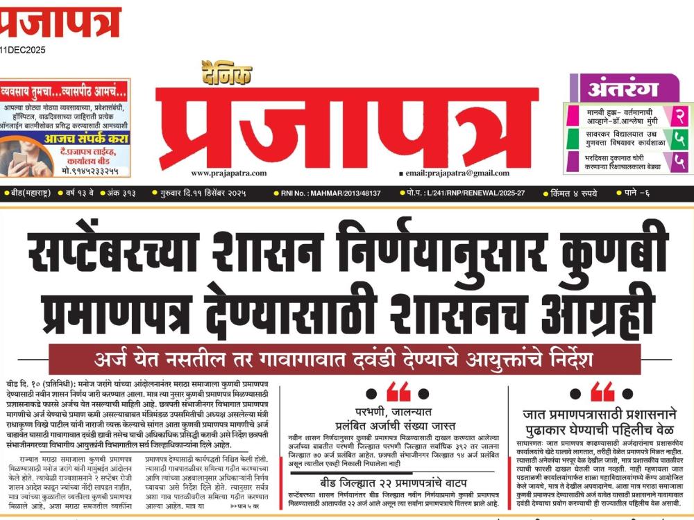 बीड दि. १० (प्रतिनिधी ) : मनोज जरांगे यांच्या आंदोलनानंतर मराठा समाजाला कुणबी प्रमाणपत्र देण्यासाठी नवीन शासन निर्णय जरी करण्यात आला. मात्र त्या नुसार कुणबी प्रमाणपत्र मिळण्यासाठी प्रशासनाकडे फारसे अर्जच येत नसल्याची माहिती आहे. छत्रपती संभाजीनगर विभागात प्रमाणपत्र मागणीचे अर्ज येण्याचे प्रमाण कमी असल्याबाबत मंत्रिमंडळ उपसमितीची अध्यक्ष असलेल्या मंत्री राधाकृष्ण विखे पाटील यांनी नाराजी व्यक्त केल्याचे सांगत आता कुणबी प्रमाणपत्र मागणीचे अर्ज वाढावेत यासाठी गावागावात दवंडी द्यावी तसेच याची अधिकाधिक प्रसिद्धी करावी असे निर्देश छत्रपती संभाजीनगरच्या विभागीय आयुक्तांनी विभागातील सर्व जिल्हाधिकाऱ्यांना दिले आहेत.