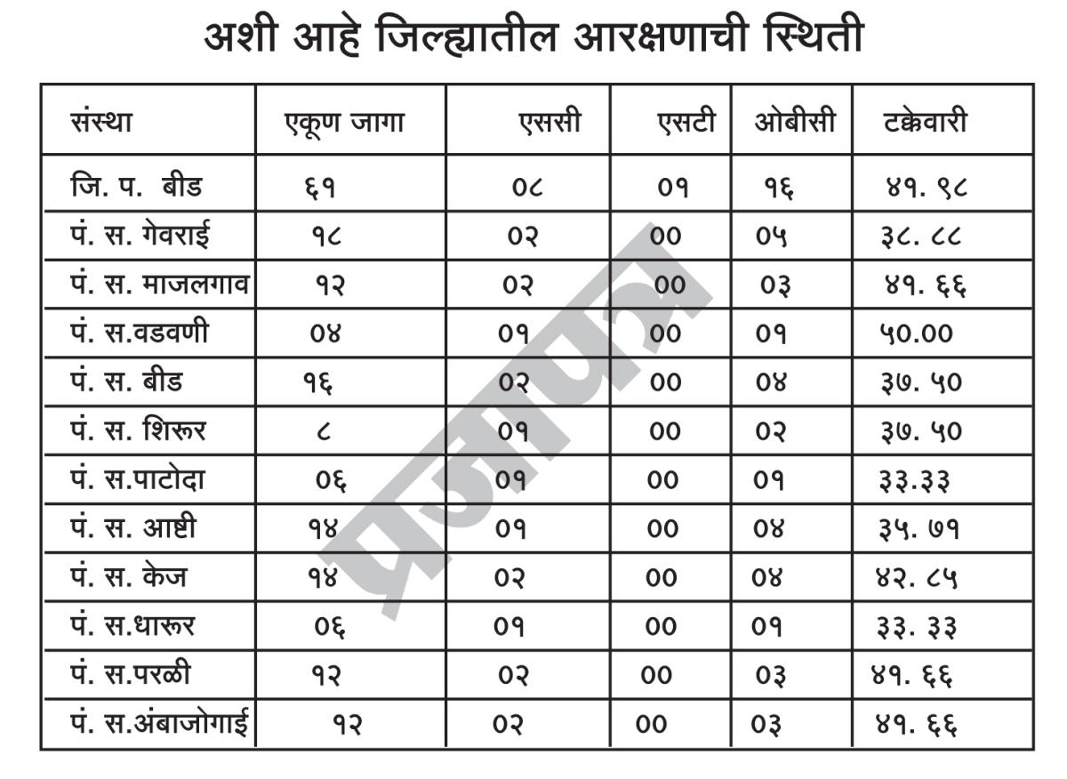 बीड जिल्हा परिषदेची सदस्य संख्या ६१ इतकी आहे.त्यापैकी अनुसूचित जाती (८),अनुसूचित जमाती (१) आणि नागरिकांचा मागास प्रवर्ग अर्थात ओबीसी १६ अशा जागा आरक्षित आहेत.याची एकूण संख्या २५ इतकी होते.ज्याची टक्केवारी ४१. ९८ % इतकी आहे.त्यामुळे येथील आरक्षण ५० % मर्यादेच्या आतच आहे. अशीच परिस्थिती जिल्ह्यातील ११ पंचायत समित्यांची देखील आहे.