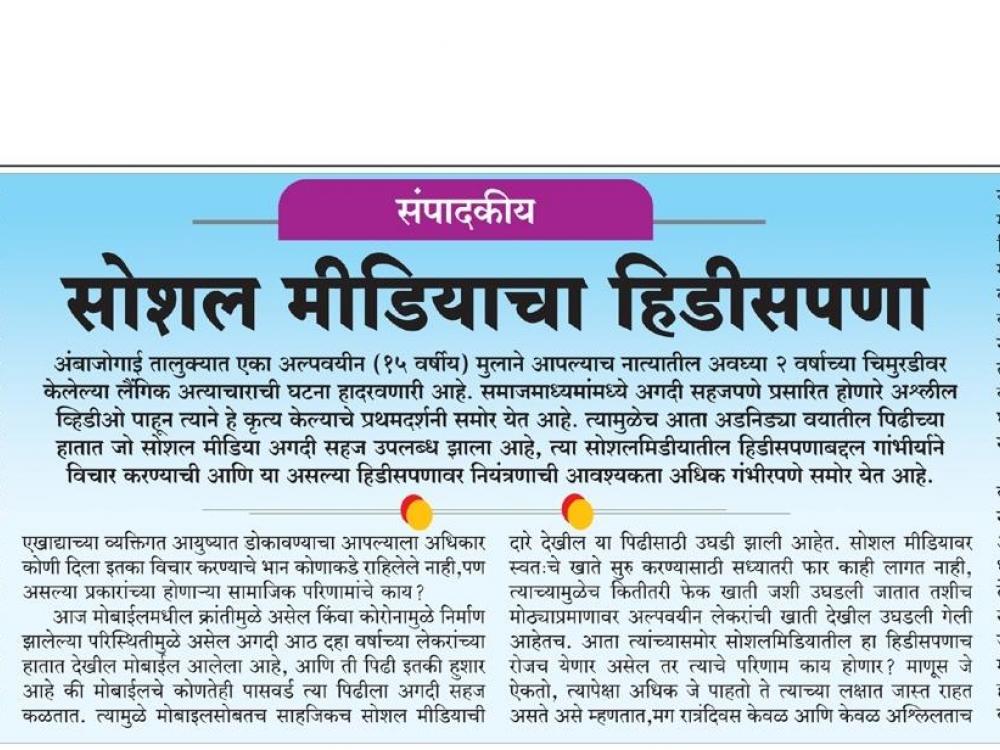 अंबाजोगाई तालुक्यात एका अल्पवयीन (१५ वर्षीय) मुलाने आपल्याच नात्यातील अवघ्या २ वर्षाच्या चिमुरडीवर केलेल्या लैंगिक अत्याचाराची घटना हादरवणारी आहे. समाजमाध्यमांमध्ये अगदी सहजपणे प्रसारित होणारे अश्लील व्हिडीओ पाहून त्याने हे कृत्य केल्याचे प्रथमदर्शनी समोर येत आहे. त्यामुळेच आता अडनिड्या वयातील पिढीच्या हातात जो सोशल मीडिया अगदी सहज उपलब्ध झाला आहे, त्या सोशलमिडीयातील हिडीसपणाबद्दल गांभीर्याने विचार करण्याची आणि या असल्या हिडीसपणावर नियंत्रणाची आवश्यकता अधिक गंभीरपणे समोर येत आहे.
