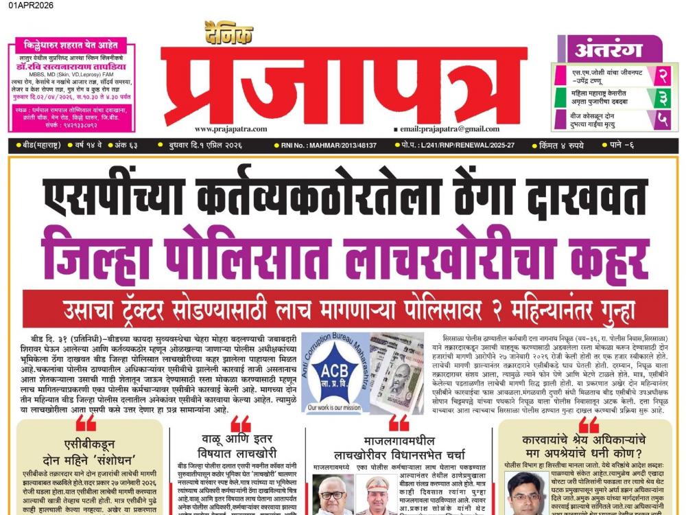 बीड दि. ३१ (प्रतिनिधी)-बीडच्या कायदा सुव्यवस्थेचा चेहरा मोहरा बदलण्याची जबाबदारी शिरावर घेऊन आलेल्या आणि कर्तव्यकठोर म्हणून ओळखल्या जाणाऱ्या पोलीस अधीक्षकांच्या भूमिकेला ठेंगा दाखवत बीड जिल्हा पोलिसात लाचखोरीच्या कहर झालेला पाहायला मिळत आहे.चकलांबा पोलीस ठाण्यातील अधिकाऱ्यांवर एसीबीची झालेली कारवाई ताजी असतानाच आता शेतकऱ्याला उसाची गाडी शेतातून जाऊन देण्यासाठी रस्ता मोकळा करण्यासाठी म्हणून लाच मागितल्याप्रकरणी एका पोलीस कर्मचाऱ्यावर एसीबीने कारवाई केली आहे. मागच्या दोन तीन महिन्यात बीड जिल्हा पोलीस दलातील अनेकांवर एसीबीने कारवाया केल्या आहेत. त्यामुळे या लाचखोरीला आता एसपी कसे उत्तर देणार हा प्रश्न सामान्यांना आहे.