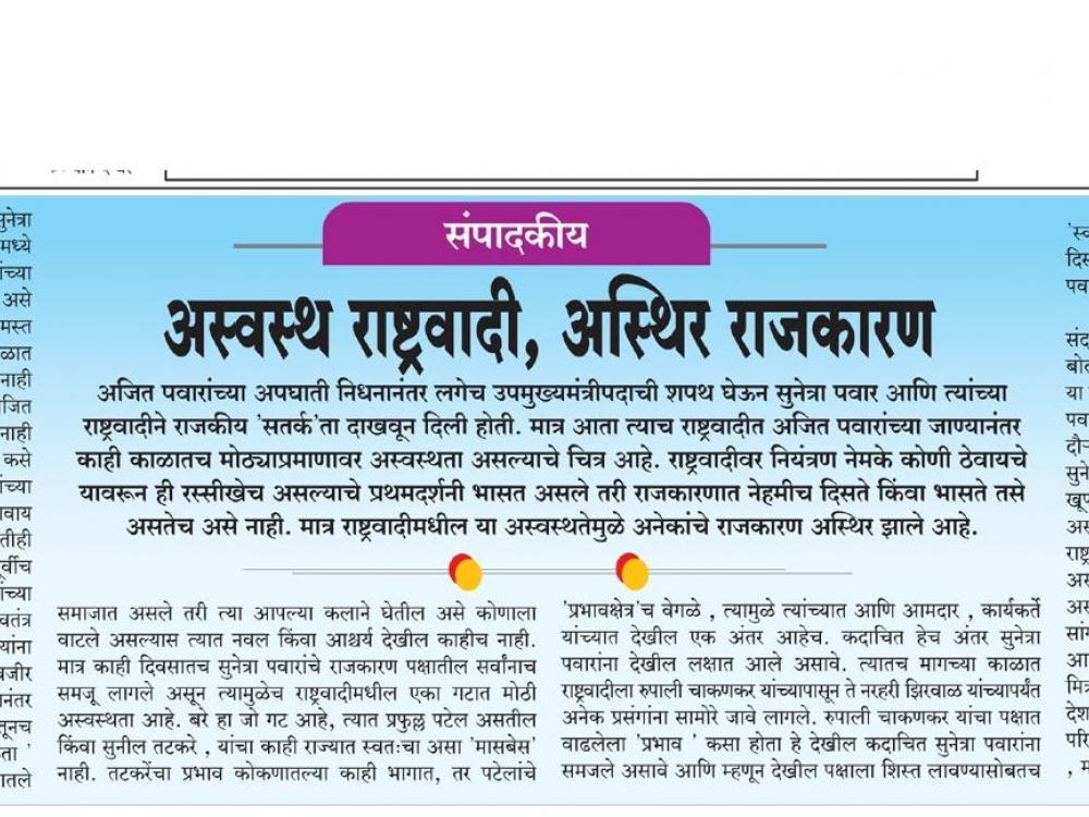 अजित पवारांच्या अपघाती निधनानंतर लगेच उपमुख्यमंत्रीपदाची शपथ घेऊन सुनेत्रा पवार आणि त्यांच्या राष्ट्रवादीने राजकीय 'सतर्क'ता दाखवून दिली होती. मात्र आता त्याच राष्ट्रवादीत अजित पवारांच्या जाण्यानंतर काही काळातच मोठ्याप्रमाणावर अस्वस्थता असल्याचे चित्र आहे. राष्ट्रवादीवर नियंत्रण नेमके कोणी ठेवायचे यावरून ही रस्सीखेच असल्याचे प्रथमदर्शनी भासत असले तरी राजकारणात नेहमीच दिसते किंवा भासते तसे असतेच असे नाही. मात्र राष्ट्रवादीमधील या अस्वस्थतेमुळे अनेकांचे राजकारण अस्थिर झाले आहे.